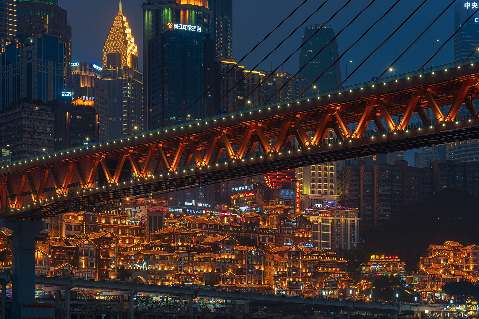 上午探访千年磁器口古镇,石板路上尝陈麻花、古镇鸡杂,宝轮寺钟声响彻嘉陵江。打卡8D魔幻标志李子坝轻轨穿楼,单轨列车从居民楼腹中穿行视觉冲击。漫步十八梯老街,"上半城,下半城"的城市肌理浓缩于此,《从你的全世界路过》取景地。乘长江索道飞渡两江,车厢外江景与城市天际线交织。夜晚洪崖洞吊脚楼灯火辉煌,现实版《千与千寻》汤屋。乘船夜游两江,长江索道、东水门大桥、朝天门码头在光影中变幻,360度立体山城夜景尽收眼底。夜宿重庆。